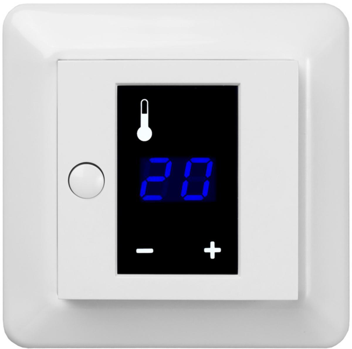 Termostat for maks 3200W. Regulerbar med gulvgiver (medfølger) eller romgiver. Begge reguleringsmetodene kan kombineres. Maks tempe for f.eks tregulv kan stilles inn. Også frostsikringsfunksjon og inngang for eksternt tidsur for temperatursenkning (4°C) finnes. Passer i apparatboks eller i forhøyningsramme. IP20.