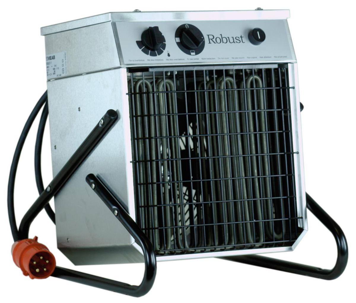 Robust F er testet og godkjent for bruk i lokaler som pga mengden støv er klassifisert som brannfarlig. Eksempel på bruksområde er stall og snekkerlokaler. Kan monteres på vegg eller stå på gulv. Varmeviften har en innebygd termostat 0-35°C og temperaturbegrenser som bryter spenningen ved overoppheting. Temperaturbegrenseren tilbakestilles automatisk når varmeviften kjølner. Deksel, nett og ben er i rustfritt stål. For å beskytte de elektriske komponentene fra fukt og støv er viften laget i kapslingsklasse IP65. Semko-godkjent, EMC-testet og CE-merket. Effekttrinn: 0-4,5-9 kW. Utstyrt med 1.8m lang tilslutningskabel med 16A stikkpropp (CEE-don).